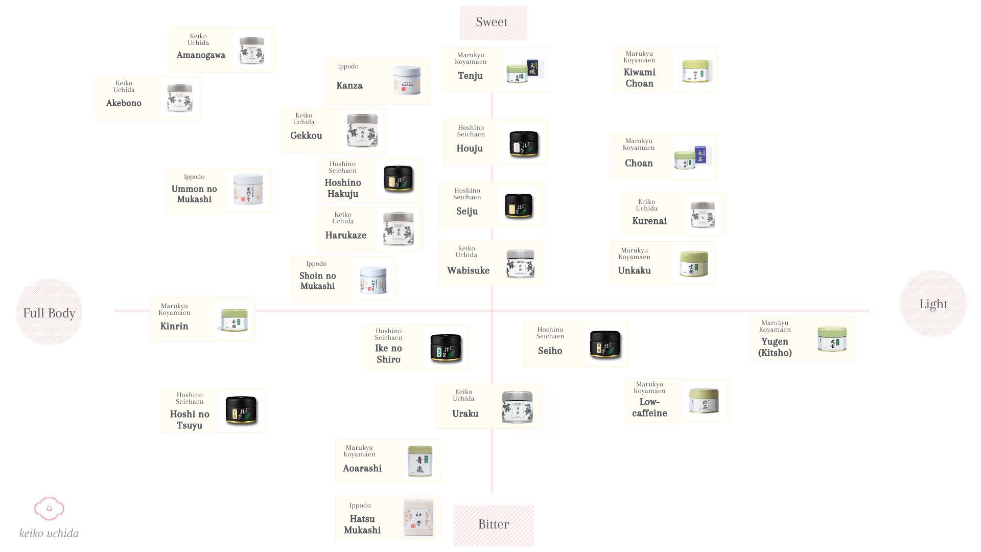 Keiko Uchida’s own brand Organic Matcha Teas have similarities in taste to the teas of Marukyu Koyamaen. Keiko’s own tea maker has strong ties with Marukyu Koyamaen, and shares similar ideas about composition and flavour. As stocks of Marukyu Koyamaen’s Matcha tea can sell very quickly this is worth noting, as Keiko Uchida’s Organic Wabisuke and Uraku, with their similar Kyoto flavours, can make very suitable alternatives.