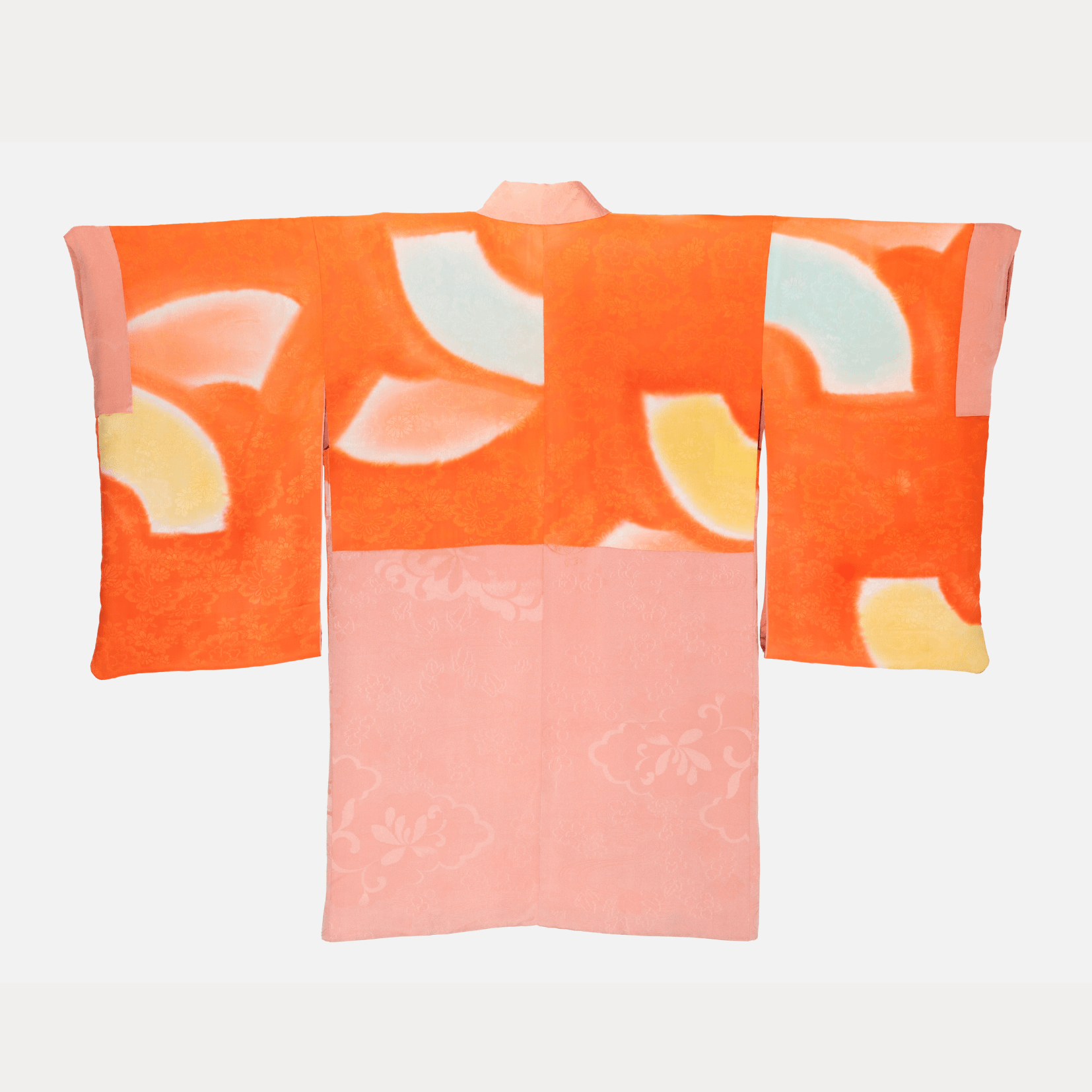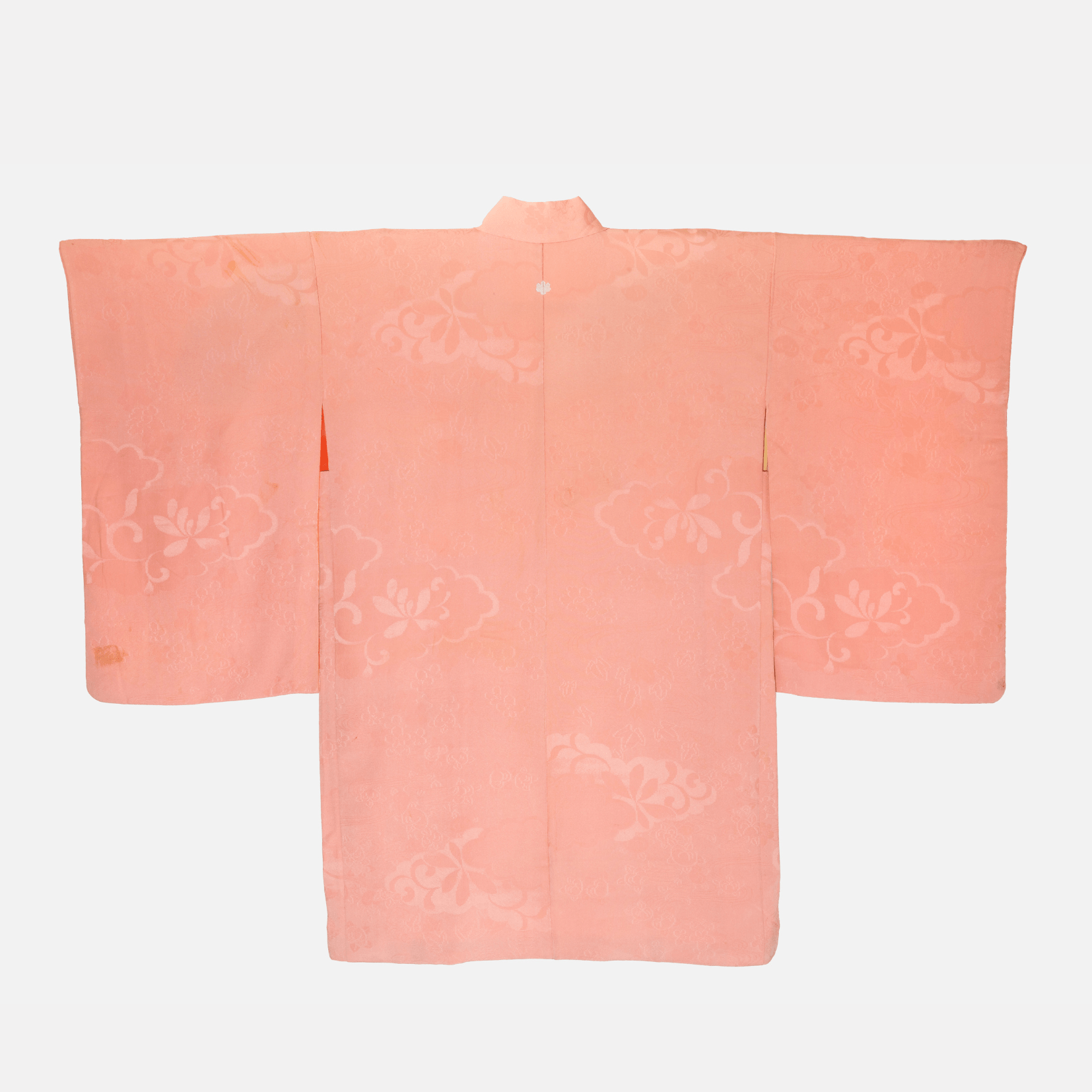 A light pink, silk, vintage (antique?) haori. The silvery pink silk is woven with a pattern of flowers, leaves and waves. The haori has an orange silk lining.
