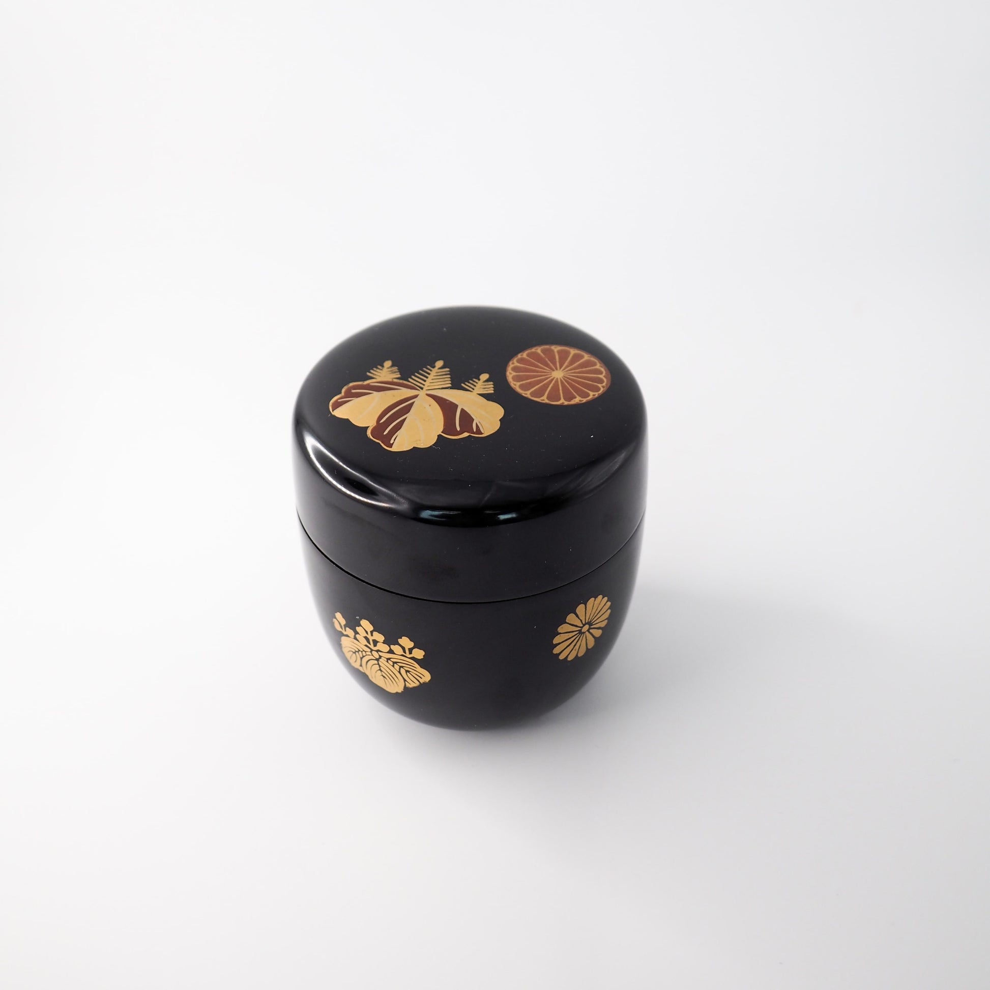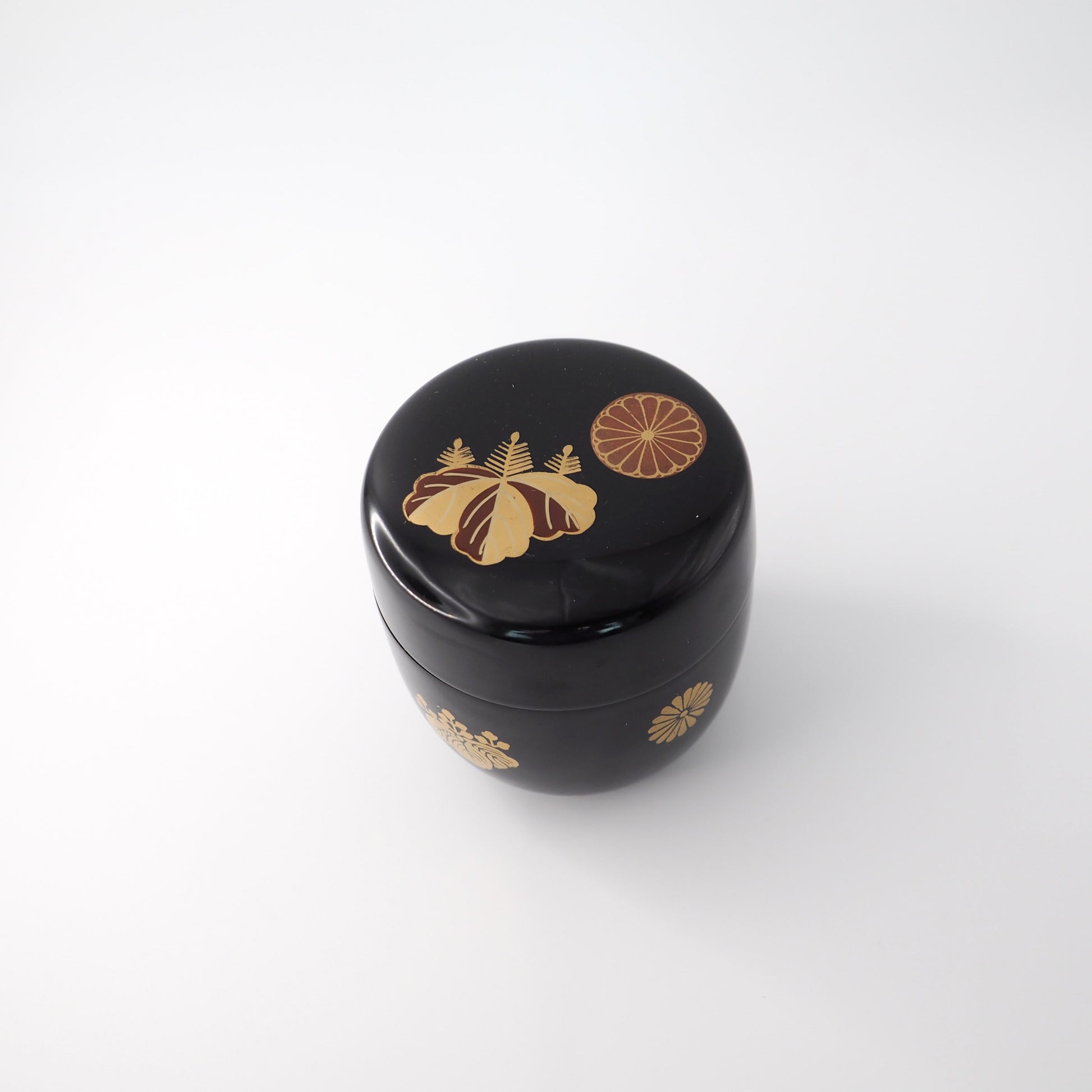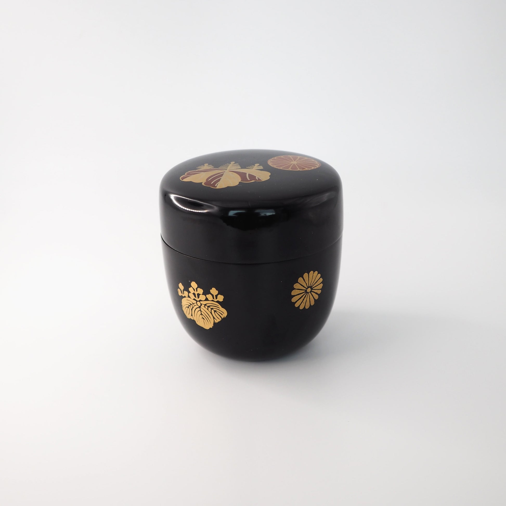 A brand new lacquered natsume tea caddy used during the tea ceremony. This natsume has the Japanese national emblem and a chrysanthemum crest in gold.