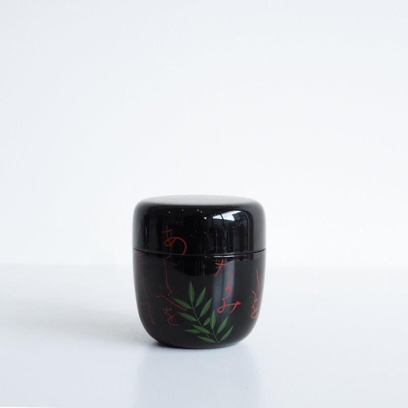 A lacquer-coated wooden natsume tea caddy used in the Japanese tea ceremony from the Yamanaka region of Japan. This striking natsume features a crane emblem on the body, a black lacquered interior, and a handwritten poem in red calligraphy. This natsume comes with its own signed wooden box.