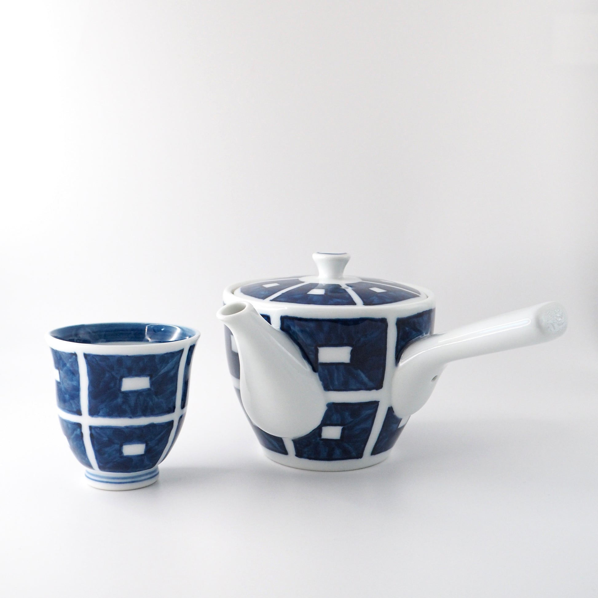 The teapot’s side-handle design offers ergonomic ease, making it ideal for controlled one-handed pouring, as is common in traditional Japanese tea ceremonies. Its slightly rounded body tapers toward the base, providing stability, while the wide, angled spout ensures a smooth, drip-free pour. The lid features the same Hishimon design, maintaining a harmonious aesthetic and balance throughout the piece. Crafted from high-quality porcelain, this teapot combines durability with the lightweight feel expected from fine ceramics.