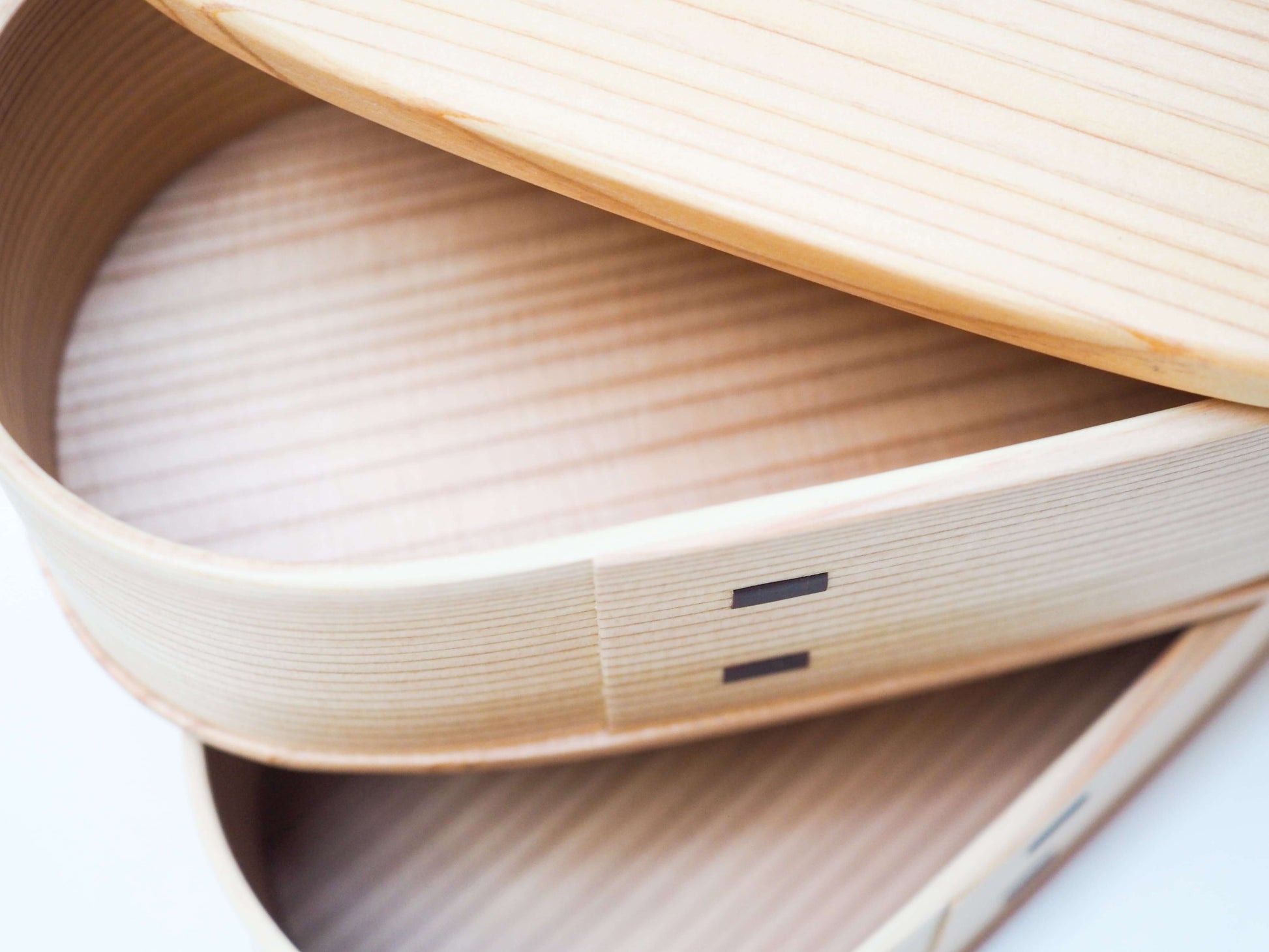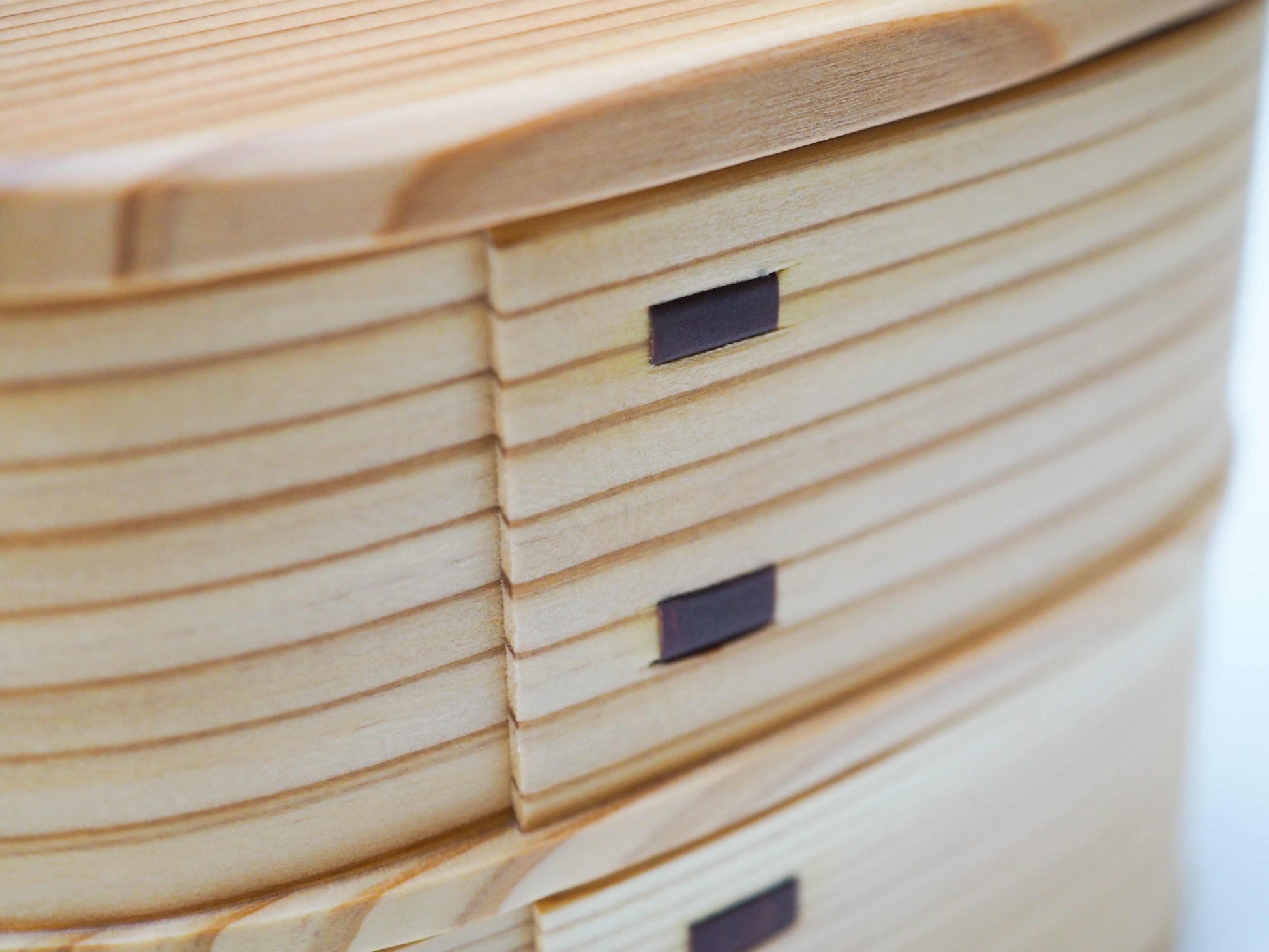 Magewappa is a way of steam bending wood than has been designated one of Japans Traditional Crafts by the Association for the Promotion of Traditional Craft Industries. This labour-intensive process involves softening planks of Cedar (sugi) before forming them into round shapes and drying them. Magewappa is notable for the light colour of the wood, and the straight grain lines that can be seen around the bento boxes.