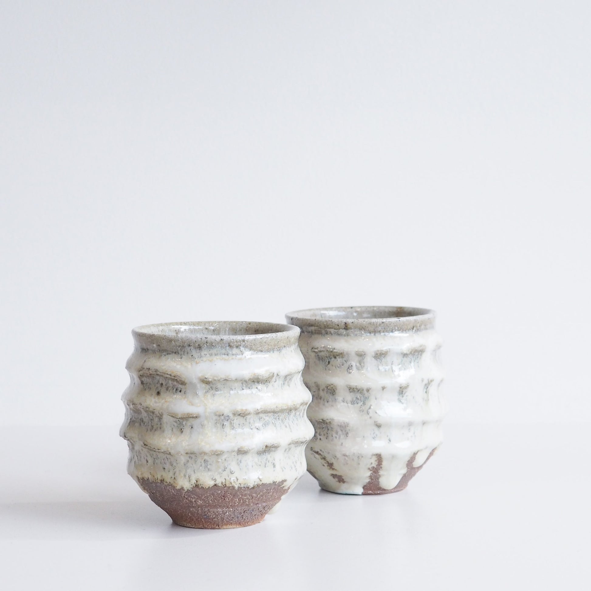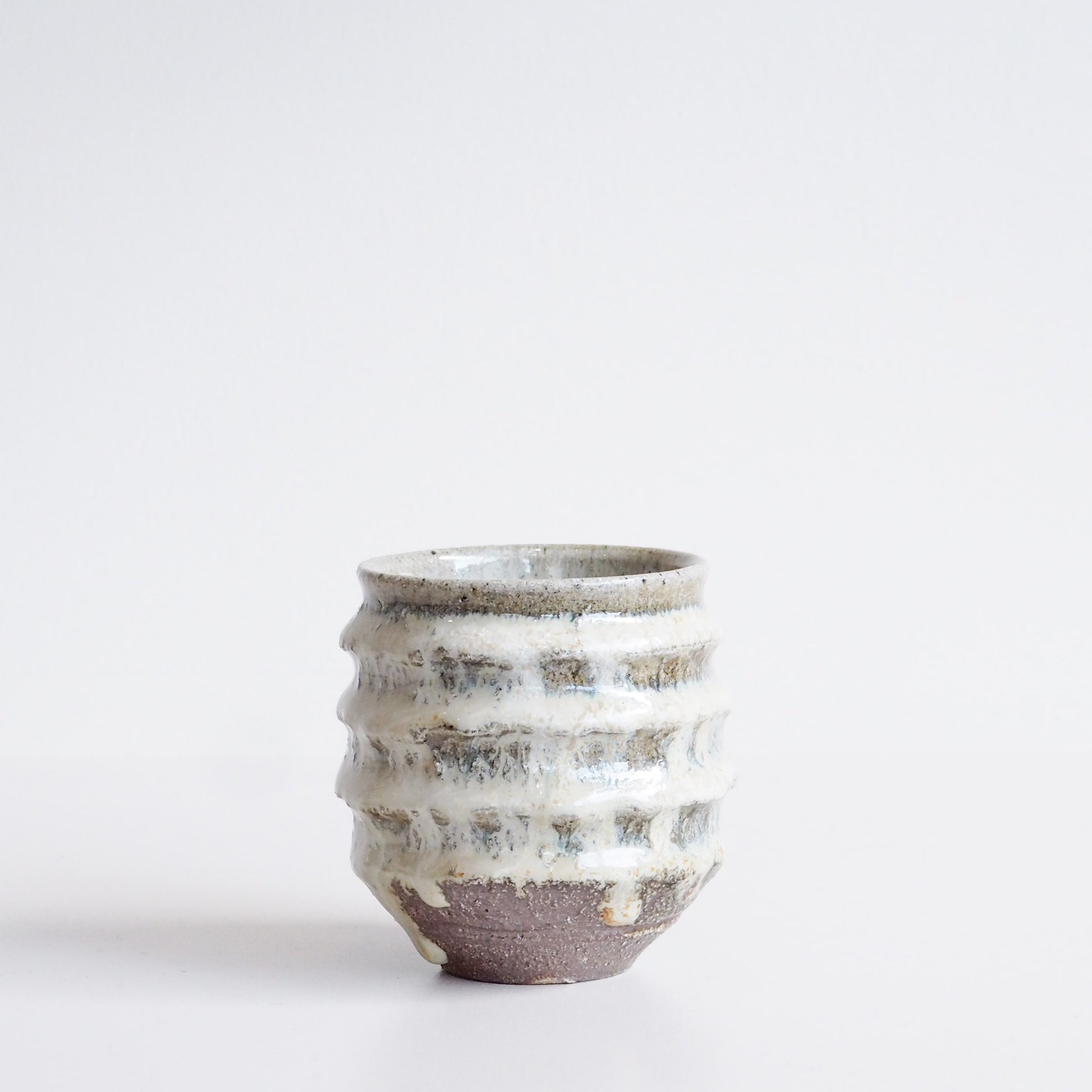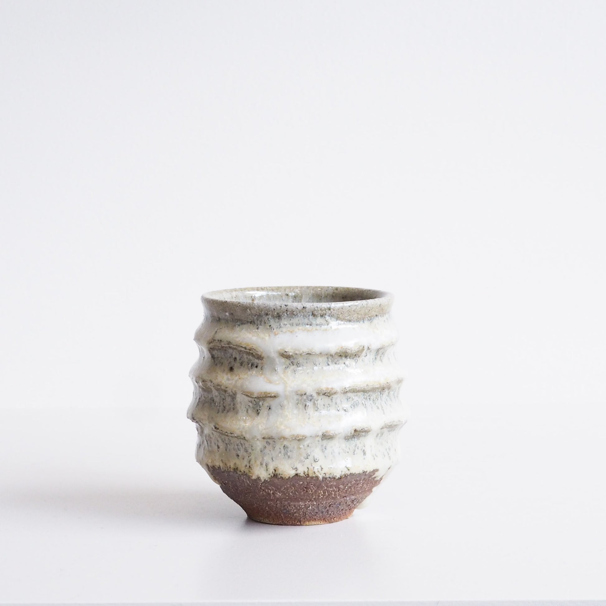 Madagaratsu is a type of Karatsu ware featuring a straw ash glaze. In reduction firing, the glaze develops a milky white colour with a bluish tint, while oxidation firing results in a yellowish tone. The effect is especially striking when used for sake, and the "Madakaratsu Sake Cup" is a refined piece, truly deserving of the title "king of sake cups. The innovative shape makes it perfect and versatile for any use.