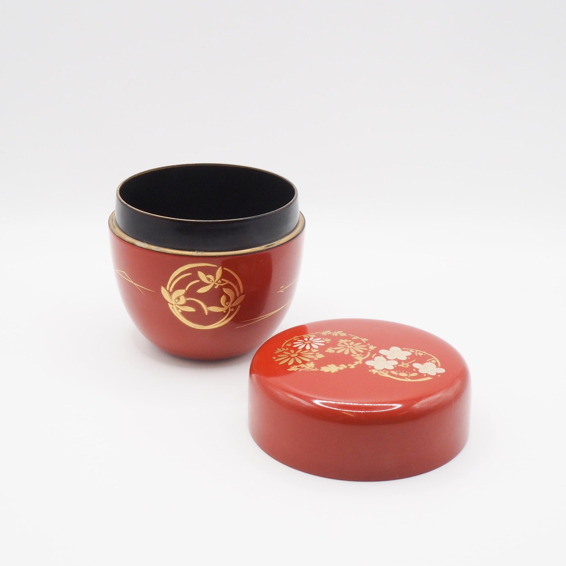 A vintage lacquered natsume tea caddy used in the Japanese tea ceremony. This striking red natsume features a Narcissus emblem on the body, a black lacquered interior, and gold-lined edging. The lid is adorned with beautiful emblems of chrysanthemum and cherry blossom.