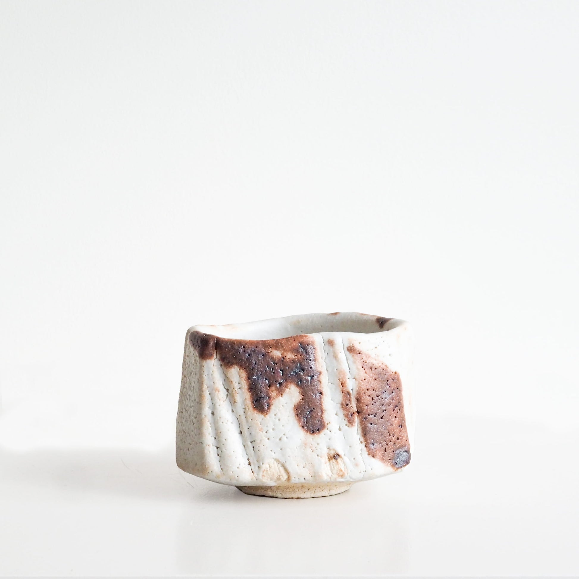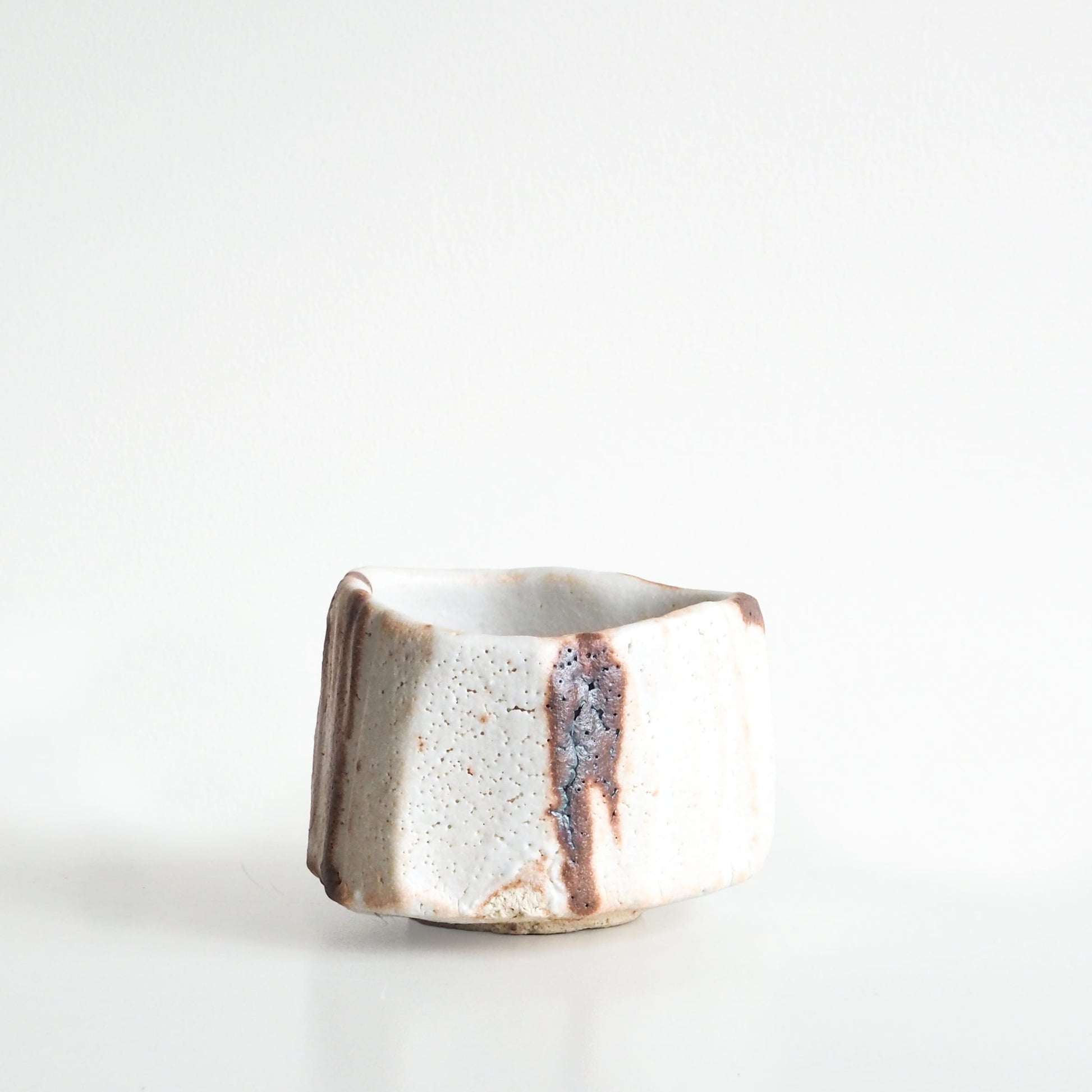This white Shino bowl has a subtly triangular form designed for a comfortable, secure grip. The angular shape contrasts with the creamy glaze, giving the bowl both visual strength and a quiet, rustic elegance like the surface of a mountain.